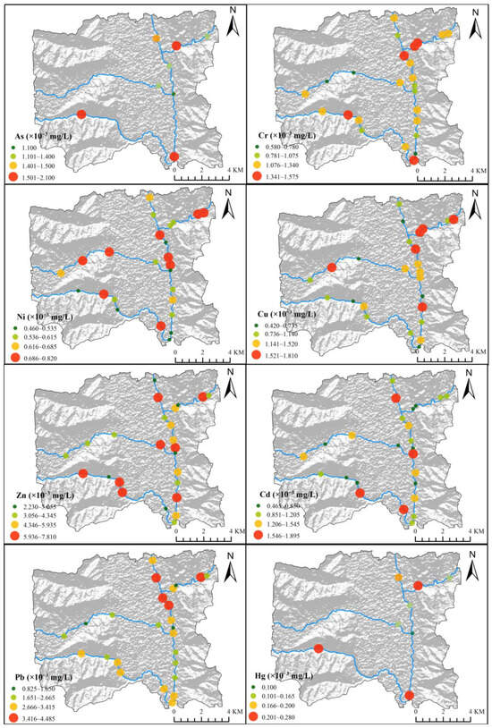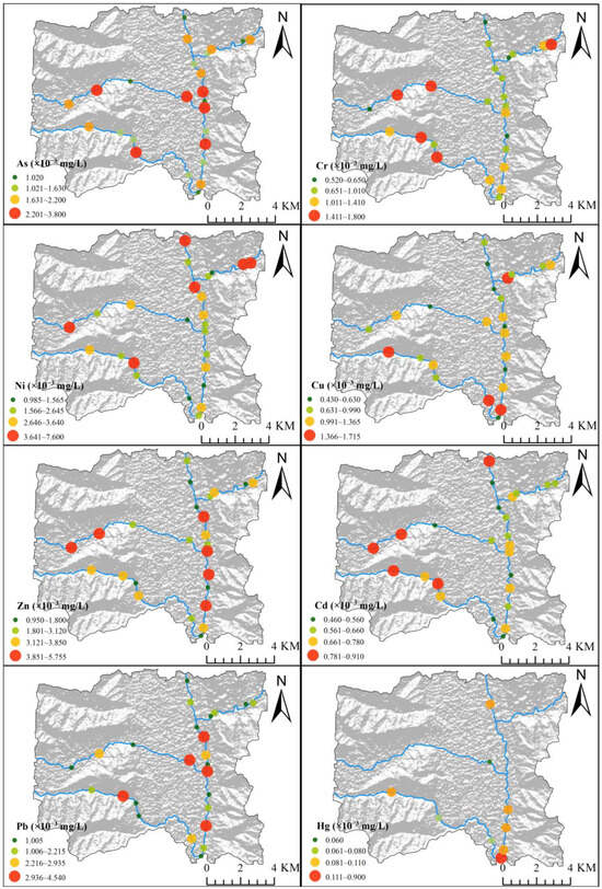 The spatial variation in water quality indicators at each sampling site was categorized into four groups using the natural breakpoint method (Figure 3 and Figure 4). This method can help predict the potential risks posed by heavy metals in surface water and offer recommendations for land use planning and water resource management []. Data were grouped into the most suitable categories to maximize the distinction between different classes []. The distribution of heavy metals varied significantly across different rivers, likely due to differences in the average concentrations, which could result from diverse pollution sources such as industrial activities, agriculture, and natural processes []. Sampling sites with high heavy metal concentrations were represented by darker colors, while lighter colors indicated lower contamination levels. It was observed that the northern rivers exhibited higher Cr concentrations compared to those in the southern region. Conversely, the southern part of the study area showed elevated Ni concentrations, potentially linked to the uneven spatial distribution of pollutants [,]. Higher Cu concentrations tended to occur across the entire river basin. Areas with increased heavy metal levels reflected industrial wastewater discharge and pesticide residues from agricultural activities, which entered water bodies via surface runoff [,]. Moreover, severe heavy metal pollution poses risks to biological health, with toxic metals accumulating in the human body and potentially leading to chronic poisoning []. The spatial distribution of Ni concentration has the same pattern as Cu. Notably, Zn and Cd concentrations in the southwest were higher than in other regions. A plausible explanation is the presence of livestock farms near rivers, where animal waste and decomposed organic matter enter surface waters through precipitation and seep into groundwater via irrigation drainage []. Furthermore, transportation activities were identified as a primary source of Cd in the environment. Cadmium is used in manufacturing brake coatings and corrosion-resistant parts [,]. Friction from braking leads to the corrosion of Cd layers, releasing Cd particles into the environment during operation []. Due to the plateau’s unique and changing environmental conditions and its ecological vulnerability, human activities along the river, such as mineral exploitation, urban sewage, sewage discharge, etc., have had a significant negative impact on water quality in recent years. Pollution is therefore an inevitable consequence. The water quality of the source area will affect the middle and lower reaches of the Yellow River, so the water quality of the study area has an important impact on the safety of humans, animals, and crops.