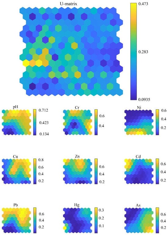In this study, a self-organizing map (SOM) was utilized to analyze the distributional variations of water quality parameters, offering a scientific basis for effective water pollution management. The results, derived by integrating the SOM with the k-means clustering algorithm, were calculated [,]. The QE = 0.424 and TE = 0.1, indicating good model fitting. The matrix, which represents the distances between weight vectors of neurons and their adjacent neurons, is termed the uniform distance matrix (U-matrix). Different colors correspond to normalized variable values, with each hexagon representing a neuron on the component plane. Smaller distances between hexagons reflect greater similarity in sample features []. The neurons on the SOM maps showing higher values corresponded to elevated concentrations of Cu, Zn, and Pb, while Ni and As demonstrated the lowest concentrations at the same locations, as illustrated in Figure 5. Additionally, Hg and Cd predominantly exhibited lower concentrations.