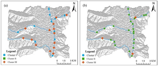 The spatial distribution of the heavy metal concentrations for each cluster. (a) flood season; (b) dry season.