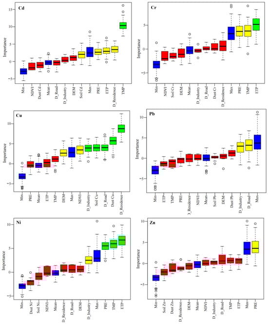 Environmental indicators were measured for both September 2023 and January 2024, including precipitation, evapotranspiration, and air temperature. Additional geographic and environmental factors were also considered: elevation, proximity to the nearest residential area, distance to the nearest road, and distance to the nearest industrial facility. Remote sensing data, including the Normalized Difference Vegetation Index (NDVI) derived from the MOD13A3 product with a 250 m resolution and 16-day composite, were incorporated into the analysis. Furthermore, heavy metal concentrations in road dust and soil within the study area were analyzed. Road dust samples (196 points) were collected, interpolated, and extracted to sampling points. Similarly, soil heavy metal concentrations were measured at 177 locations, with interpolation followed by extraction to sampling points. After small stones as well as organic debris were removed and air-dried, the soil samples were broken up and sifted through a fine sieve of 1 mm. Soil samples and road dust samples were digested in an acid mixture of 65–68% HNO3, 36–38% HCl, and 40% HF (6 mL, 2 mL, and 3 mL) with microwave digestion.
