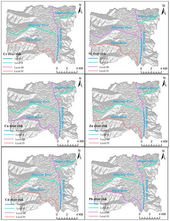 The NDVI, the distance from the sampling sites to industry, and potential evapotranspiration and potential evapotranspiration were combined with heavy metal concentrations in dust and soil to evaluate water quality using the IFN-SPA approach []. This technique assesses the relative significance of factors through comparative analysis. The approach highlights the significance of each factor by measuring the relative distance between evaluation samples and the defined criteria. The risk levels are categorized into very low risk (≤0.2), low risk (≤0.2–0.4), medium risk (≤0.4–0.6), high risk (≤0.6–0.8), and very high risk (≤0.8–1.0). According to this classification and methodology, the results (Figure 8) revealed that heavy metal risks were lower in the downstream section of the Beichuan River, whereas the upstream section exhibited higher risks. The enterprises in the upper reaches of the basin may have discharged some wastewater and gas polluted with heavy metals. Most of the tributaries of Majuanggou River and Jingyang River showed level II risk. The risk of heavy metal pollution in Sigou River was shown to be level III and level IV. There are indeed some livestock and poultry farms next to the Sigou River, and there will be disorderly discharge and accumulation of feces, and the odor is more intense. Therefore, the risk of heavy metal pollution is higher in the Sigou River.