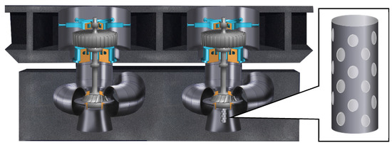 The two researched low-head Francis turbine units are installed in the same power plant, so the main parameters of the two units are the same. The basic parameters of the two units are listed in Table 1. From the table, it can be seen that the rated head, number of blades and guide vanes, and rotating speed are exactly the same between the two researched units. The main difference between these two units lies in the design of the spiral casing and the process of the center hole of the shaft: Unit A has no special processing on the center hole of the shaft, while an extension tube is mounted on the center hole of the shaft of Unit B. The extension tube has the same diameter as the center hole of the runner. The thickness of the extension tube is 8 mm and the length of the tube is 2 m. Small holes have been drilled on the extension tube in order to uniformize the air injection from the extension tube to the draft tube. A sketch of the extension tube is shown in Figure 1. To reveal the effect of the different designs on the vibration behavior of the machine, field tests are conducted on both units.