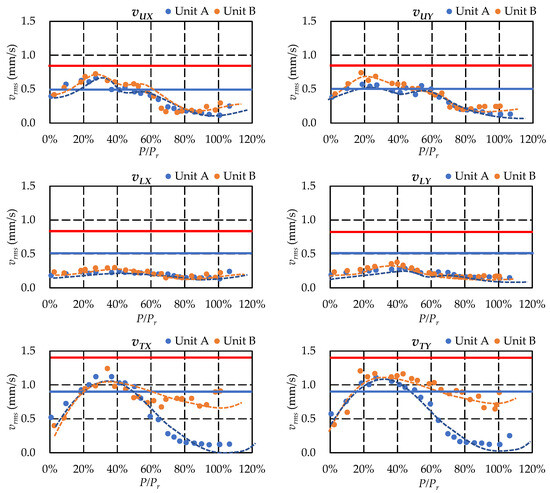 Figure 8 shows the variation of vibration behavior of the upper generator bearing, lower generator bearing, and headcover of Units A and B, where the vibration of X direction is shown on the left and the vibration of the Y direction on the right. The red and blue lines represent the limitation values of TRIP and ALARM level, respectively, defined by the ISO standard. From the figures, it can be seen that variation of the vibration level shows the same trend on both units. The vibration level increases to its highest level at around 30% rated output. Then the vibration decreases until the machine is operating at the best efficiency point. The absolute vibration level increases again when the machine increases its output. In the range of low load, the absolute vibration levels of the head cover are almost the same between the two machines on all the measurement points. The highest vibration level of the two machines is 1.1 mm/s, which is measured from the head cover. From 50% load to overload, the vibration of the head cover shows different absolute values between the two units, despite the same trend. The vibration level of Unit A decreases to almost zero when the output increases to rated load, while the vibration level of Unit B shows a smaller decrease with the increase of load. Under the rated load, the vibration velocities of Unit A and Unit B are 0.7 mm/s and 0.1 mm/s, respectively.