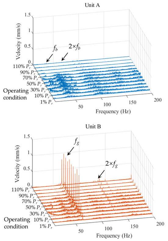 Spectra waterfall of the head cover vibration under different loads of Unit A (in blue) and Unit B (in orange).
