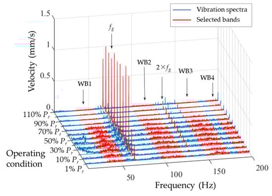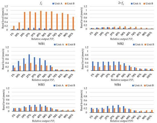 In order to compare the influence of fg frequency and the wide band frequency on the vibration level of the units, the coordinate bands are selected and the band levels are calculated. As shown in Figure 10, the band of fg and 2 × fg with a band width of 2 Hz are selected to represent the amplitude of fg and 2 × fg, respectively. The wide bands 1 to 4 (WB1, WB2, WB3, and WB4) are selected according to the common high-amplitude band from the waterfalls of Unit A and Unit B. The ranges of the bands are listed in Table 2. The band values of the selected six bands are calculated according to Equation (1). The calculated band values are shown in Figure 11. The highest level of Unit A is WB1 (between 30 and 50 Hz), while the highest level of Unit B is fg. When the load increases from zero to full-load, the wide band vibration level decreases in Unit A, which causes the decrease of the overall vibration level of Unit A. For Unit B, the amplitude of fg is low under deep part load. This is because the distance between the guide vanes and the runner blades is far. When the output of Unit B increases to 25%, the amplitude of fg increases from 0.20 mm/s to 0.94 mm/s. Under this load, the fg band level of Unit A is only 0.10 mm/s. The band value of fg in Unit B is nearly 10 times that in Unit A. From 25% rated load to rated load, the level of fg has a slight decreasing trend but maintains a high level. This causes the difference in the overall vibration level under higher loads between Unit A and Unit B. It can be inferred that the high level of fg on Unit B is caused by the uneven guide vanes, which result in uneven pressure in the circumferential direction.