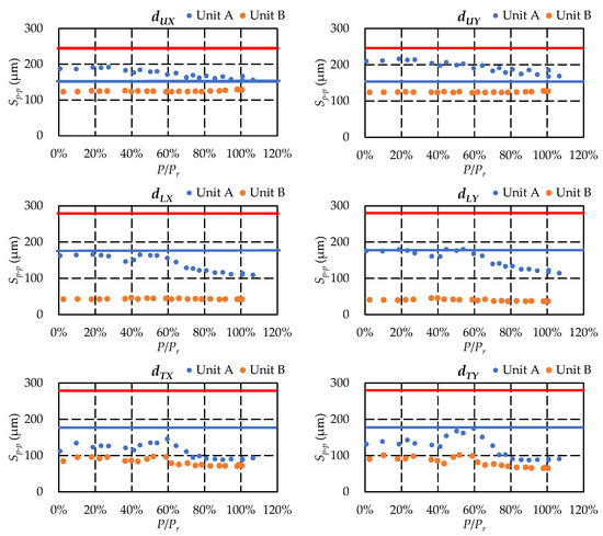 Figure 12 shows the variation of shaft axis deviation on the location of upper generator bearing, lower generator bearing, and headcover of Units A and B, where the displacement of the X direction is shown on the left and the vibration of the Y direction on the right. This displacement means the relative displacement of the shaft with respect to the bearing housing. From the figures, it can be seen that the variation of the displacement level shows different trends on the two units. The displacement shows a decrease trend in Unit A while remains almost constant on Unit B. Only the displacements on turbine bearing show similar trend on both units. On turbine bearing, the displacement level increases to its highest level at around 60% rated output. Then it decreases monotonically until overload. The displacement level of Unit A is always higher than Unit B, which implies that the stability of Unit B is better than Unit A. For Unit A, the lowest displacement appears on turbine bearing. For Unit B, the lowest displacement appears on lower generator bearing. Generally, turbine bearing withstands the highest hydraulic force on radial direction. It is normal to have higher displacement on turbine bearing. Therefore, it is not common to have the case of Unit A with lowest displacement on turbine bearing. For Unit A, the highest displacement occurs on the Y direction of the upper generator bearing. The level is 216 μm, which surpasses the ALARM level. The highest displacement level of Unit B occurs in the upper generator bearing. The level is 128.38 μm, which is within the ALARM level.