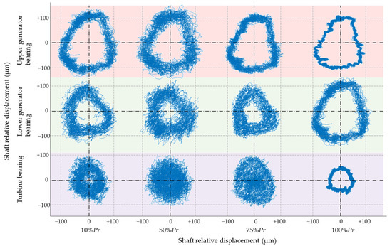 The shaft orbit is one of the most important indicators in the diagnosis of hydraulic turbines. It contains more information than the displacement of the shaft on the X and Y directions. In this research, the shaft orbits of the two machines under different loads are compared. The shaft orbits are measured by proximity probes installed on the X and Y directions of the upper generator bearing, lower generator bearing, and turbine bearing. Four loads are compared, which are 10%, 50%, 75%, and 100% rated output. Ten rotation cycles were conducted in the shaft orbit. As shown in Figure 13 and Figure 14, each row in the figure represents the shaft orbits in the same position, while each column represents the shaft orbits in different positions under the same load. From Figure 13, it can be seen that the orbits of Unit A are all circular-shaped under different loads. However, the sizes of the circles show different variation trends in different positions. Under low load, the radius of the shaft orbit increases from the turbine bearing to the upper generator bearing. Under rated output, the shaft orbit of the lower generator bearing shows the largest size. The deviation size of the turbine bearing is always the smallest in the whole output range. Under low load conditions, the shaft axis significantly vibrates along the shaft orbit. Under rated output conditions, the shaft axis keeps close to the orbit, which shows the stronger regularity of the shaft axis. The shaft orbit of Unit B in Figure 14 shows a greater difference from the ones of Unit A. The orbits show non-circular shapes under the whole operating range. The part with the smallest deviation is the lower generator bearing. The orbit with the best regulation appears under 10% load rather than the rated load. The shaft orbit and its changing rule are totally different between the two units.