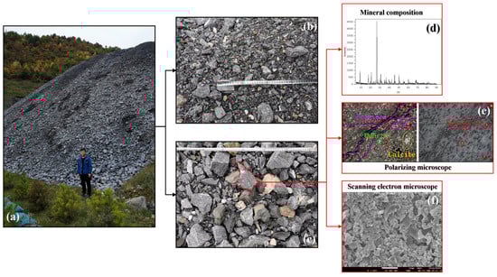Material of lead–zinc waste slag, (a) lead–zinc waste slag deposition located in Fengxian, Shanxi Province, China, (b,c) the raw lead–zinc waste slag, (d–f) the main mineral composition was derived by performing X-ray diffraction, polarizing microscopy, and scanning electron microscopy measurements, respectively.