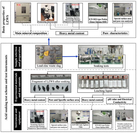 After soaking, various analytical techniques were applied to characterize the soaking liquid and the samples from the waste slag, as shown in Figure 2. For the soaking solution, the parameters pH (ST2100 pH meter, REX, Shanghai, China), electrical conductivity (DDB-303A electrical conductivity meter, REX, Shanghai, China), and the content of 5 heavy metals, including lead, zinc, cuprum, cadmium, and chromium (ICP-OES, PerkinElmer Optima8000, Waltham, MA, USA; and ICP-MS, Agilent 7900, Beijing, China), were measured in triplicate at the extraction time to ensure accuracy.