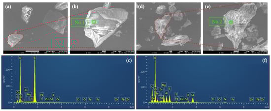 The elemental distribution raw LZWS by SEM-EDS: (a,d) and (b,e) were part of the enlarged raw LZWS; (c,f) were EDS of elemental distribution of No.1 and No.2.