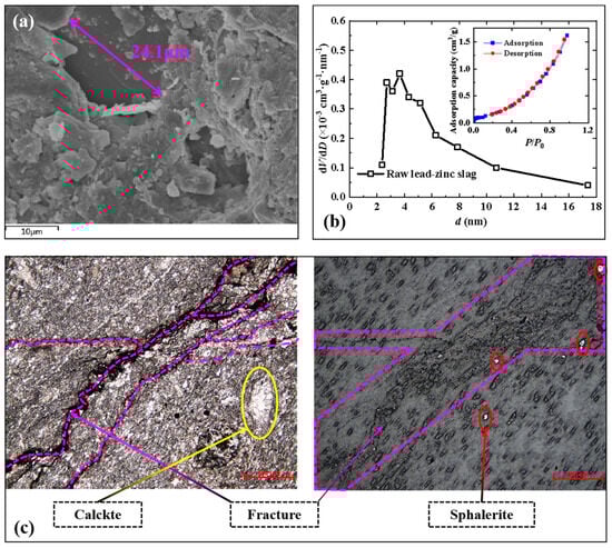 Pore distribution and pore characteristics of the raw lead–zinc waste slag, (a) pore characteristics from SEM-EDS images, (b) pore volume distribution via specific surface area and pore size analyzer, and (c) the pore distribution acquired from polarizing microscope.