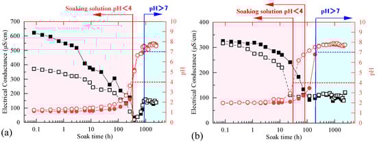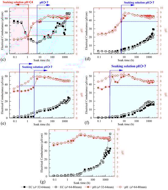 Variation in the electrical conductivity and pH value of the soak solution with time: (a) the initial pH = 1 of soak solution, (b) the initial pH = 2 of soak solution, (c) the initial pH = 3 of soak solution, (d) the initial pH = 4 of soak solution, (e) the initial pH = 5 of soak solution, (f) the initial pH = 6 of soak solution, and (g) the initial pH = 7 of deionized water.