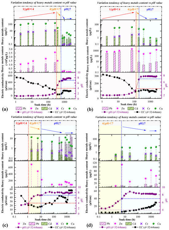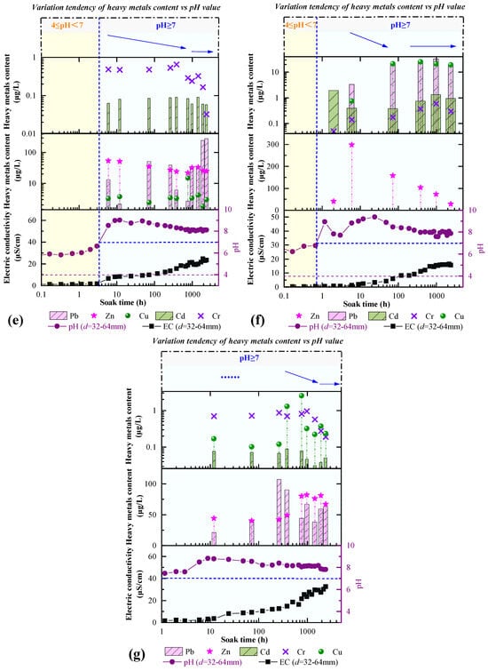 Taking the soaking solution of the waste slag samples with a size of 32–64 mm as examples, the variation in the heavy metals in an acidic environment, with time bounded by a pH value of 4, showed different change characteristics. When the pH value was less than 4, the release content of five kinds of heavy metals in solution significantly increased with time. When the pH value of the soaking environments changed from 4 to 7, the release content gradually decreased with time (Figure 6a–c). Moreover, it was found that when the initial pH value of the acid soaking solution was greater than 4, the change characteristics of five heavy metals in the waste slag soaking environments (Figure 6d–g) were consistent with that of the pH value changing to higher than 4 with time. However, the initial value was less than 4 (as shown in the six yellow areas in Figure 6a–c). These results showed that the solution environment is limited by a pH value of 4, and the precipitation of heavy metal ions and the electrical conductivity of the solution were quite different in different acid soaking environments. This result could also interpret the change in the environment around the mine under an acidic environment [29]. After the pH value of the soaking environment changed to more than 7, the content of heavy metal ions in the soaking solution tended to be stable after entering the alkaline environment, indicating that the active degree of heavy metal ions in this environment was not significant.
