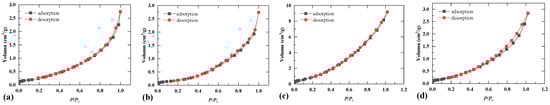 According to the isothermal linear diagram made from low-temperature nitrogen experimental data (Figure 4b and Figure 7), it can be seen that the absorption and desorption isotherms of the original lead–zinc waste slag and the acid soaking with the initial pH value were mainly type III, and the hysteresis loop was type H3 according to the shape results of the adsorption–desorption curve [32]. These results indicated that the pores of the sample were mainly composed of fractured pores.
