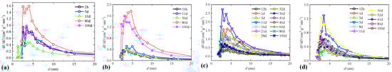 Pore volume of lead–zinc waste slag samples in different acid soaking times at different pH: (a) waste slag sample at pH = 1, (b) waste slag sample at pH = 3, (c) waste slag sample at pH = 5, and (d) waste slag sample with deionized water.
