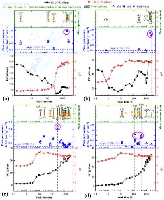 Variation in EC, pH, pore volume, and mean aperture with time at different pH in the acid soaking environment: (a) waste slag sample at pH = 1, (b) waste slag sample at pH = 3, (c) waste slag sample at pH = 5, and (d) waste slag sample with deionized water.