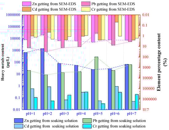To determine the origins of heavy metals’ decreasing content when the pH value of the acid environment was more than 4, as shown in Figure 6, SEM-EDS elemental energy spectrum analysis was carried out on the waste slag sample after acid soaking. The goal was to provide the composition and content of elements on the surface of the sample. The results showed that the content of heavy metals adsorbed on the surface of waste slag was high, and the content of heavy metals in the soaking solution was low, as depicted in Figure 10. The decrease in the heavy metal elements in the soaking solution with the increase in the infiltration time was due to adsorption on the surface of the waste slag again. Therefore, for the waste slag in the acid environment, a shorter soaking time is beneficial for the migration of heavy metals.