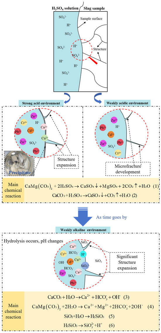 It is well-known that the change in the physical and chemical properties of the lead–zinc waste slag in an acid environment includes the process of dissolution, precipitation, release, enrichment, and pore structure change [34]. Due to the different pH values of the soaking environment, significant differences in ion exchange, pore structure development, and pH change with time were detected, as shown in Figure 11. First, the presence of a large amount of H+ in the acidic environment will dissolve the calcite in the waste slag. With the consumption of H+, the ion activity decreased, and the ion exchange process between H+ and the waste slag surface tended to be slow with time. The chemical reaction that takes place is shown in formulas 1 and 2 of Figure 11.