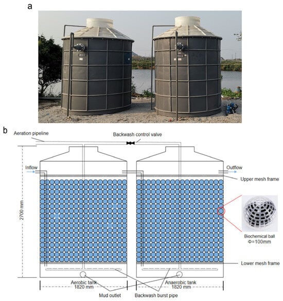 The structure of the aquaculture wastewater treatment system used in this research is shown in Figure 1. The system consisted of 2 tanks (diameter × height: 1820 mm × 2700 mm) with an effective water depth of 1.8 m and an effective volume of 4.58 m3. Each tank had 1 hollowed-out mesh frame made of a rigid material at the top and bottom. The lower mesh frame was 30 cm from the bottom and the upper mesh frame was 50 cm from the top. A biochemical ball filling was used in the tank body between the upper and lower net frames. Biochemical spheres were mainly used to form biofilms. These spheres contained polyurethane sponges. The top of the tank was equipped with a non-closed cover plate, which allowed the gas produced inside the equipment to overflow while reducing the inflow of external oxygen. This setup was conducive to creating an anoxic environment for denitrification and denitrogenation inside the equipment.
