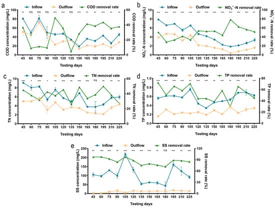 Pollutant concentrations in untreated and treated wastewater. * p < 0.05, ** p < 0.01, and *** p < 0.001 represent a statistical difference and “ns” mean the difference is not statistically significant. (a) The removal effect of COD; (b) the removal effect of NO3−−N; (c) the removal effect of TN; (d) the removal effect of TP; (e) the removal effect of SS.
