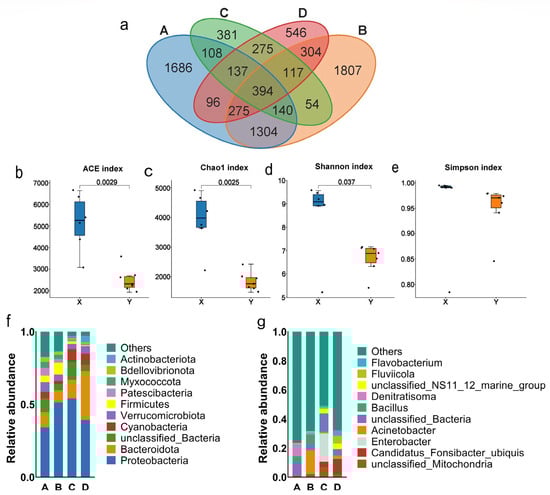 Bacterial community diversity and community structure. (a) Venn diagram of the shared and unique OTU numbers. (b–e) are the alpha diversity indexes. The horizontal coordinates X and Y represent the fill and water in the sewage treatment system, respectively. (f,g) are the phylum level and genus level of the bacterial community composition, respectively. The horizontal coordinates A, B, C, and D represent the filling of the anaerobic tank, the filling of the aerobic tank, the water in the anaerobic tank, and the water in the aerobic tank, respectively.