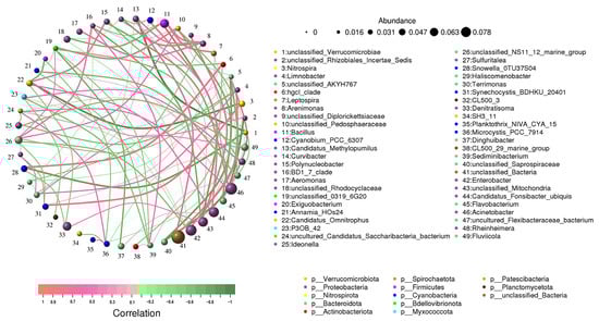 The species association network map shows the correlation between different species, and the relationships between species are represented by lines, where the size of the circles reflects the relative abundance of the species. Figure 4 demonstrates that Proteobacteria, with more nodes and connections, occupied a dominant position in the interaction relationship, followed by Bacteroidota. In conclusion, the effects of Proteobacteria and Bacteroidota on aquaculture wastewater remediation were due to their ability to remove pollutants, alongside playing an important role in maintaining the stability of the microbial community in the wastewater treatment system.