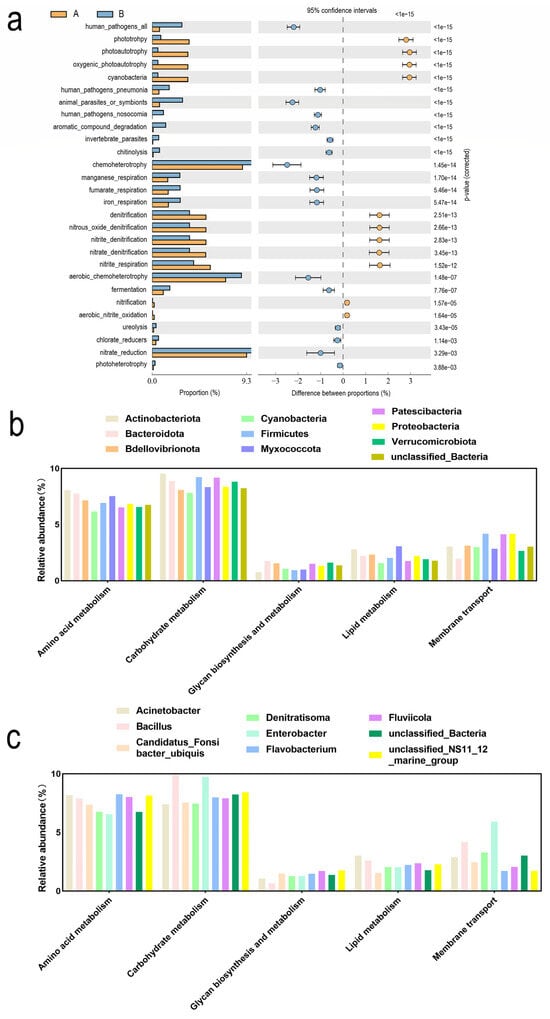 Prediction of bacterial community functions. (a) Functional predictions for FAPROTAX; (b) functional prediction of PICRUSt2 at the phylum level; (c) functional prediction of PICRUSt2 at the genus level.