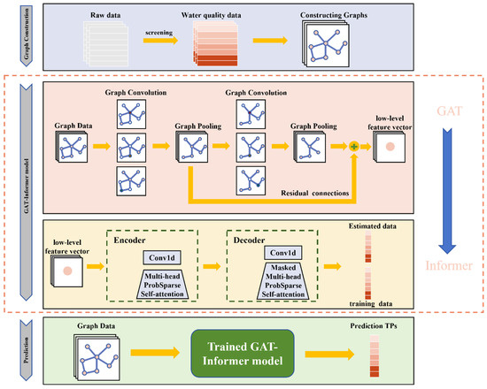 The paper proposes a water quality prediction model that comprises three main parts: spatiotemporal graph data preparation, model construction, and model prediction. The first step involves preprocessing the raw data from each site, which includes handling outliers and missing values, data standardisation, spatial site selection, and time lag adjustment. The pre-processed multivariate time series data are then transformed into graph-structured data. This study employed a GAT to extract spatial feature information from the graph-structured data, followed by Informer to extract time series feature information from the low-level data. The trained model was then used to obtain the prediction results for the test dataset. During the training process, the GAT’s attention mechanism focused on the influence between different sites. This influence varied continuously during the training iterations, simulating the diffusion trend of total phosphorus concentration in rivers.