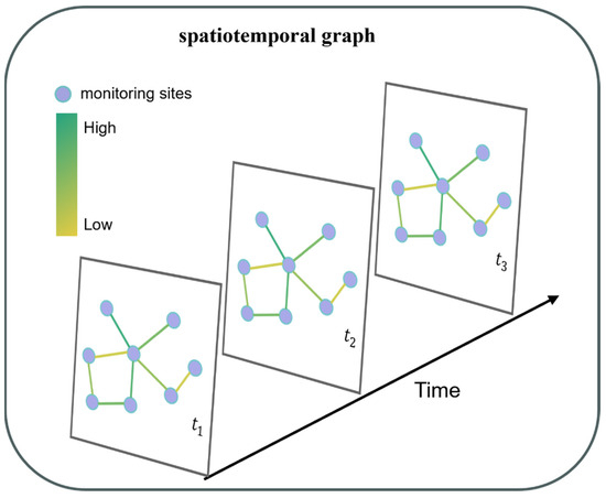 Water quality monitoring sites distributed throughout the watershed record historical water quality data for a given site. Water quality at a site in a watershed not only changes over time but is also usually influenced by upstream, downstream, and nearby areas, resulting in complex spatial and temporal relationships between water quality monitoring sites. As shown in Figure 3, the spatial relationship of each monitoring site can be defined as a spatial topological map, denoted as , where denotes the sequence of total phosphorus concentrations at monitoring sites in the watershed; E denotes the set of edges that make up the graph, representing the connectivity between the sites; and is a weighted adjacency matrix representing the spatiotemporal relationships between the nodes.