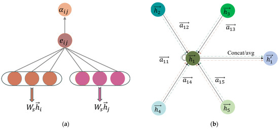 where denotes the computation of the self-attention mechanism and is the trainable weight parameter for the feature transformation of the nodes in the layer. As shown in Figure 4a, the weight coefficients are transferred into the softmax layer and activated using the LeakyReLU function , and finally obtain the attention coefficient [41].