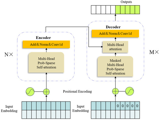 In addition to spatial features, extracting temporal features is also important for long-time-series water quality prediction. The Informer model is a model developed based on the Transformer framework, capable of effectively addressing long-sequence-time-series forecasting problems [37]. As depicted in Figure 5, the architecture of the Informer network retains the model structure of the Transformer encoder–decoder and introduces three improvements based on the Transformer model. These enhancements enable the Informer model to excel in long time series forecasting tasks: