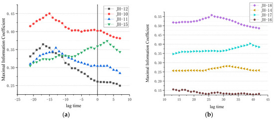 MIC is a statistical method for measuring the magnitude of correlation between two sequences. Considering the temporal lag of water quality from upstream sites affecting downstream sites, this study employed MIC to assess spatial correlations between upstream and downstream sites at different lag times. Taking JH-13 and JH-15 as examples, each time these sites were considered as benchmarks, their spatial correlations with adjacent sites were studied at various lag times. Experimental results, as shown in Figure 6, revealed noticeable temporal lags between upstream and downstream sites. For instance, in Figure 6a, depicting the experimental results between JH-13 and its adjacent sites, the MIC correlation values between JH-13 and its upstream and downstream sites were all greater than 0.35 after temporal lag adjustment. At a lag time of −15, the maximum correlation of total phosphorus data with JH-13 was observed at JH-10, with a value of 0.45, followed by downstream site JH-15, with a value of 0.374 at a lag time of +3. Figure 6b illustrates the experimental results between JH-15 and its adjacent sites, indicating that only JH-17 and JH-18 exhibited high spatial correlation with JH-15. At a lag time of +26, JH-18 showed the highest MIC value of 0.561 for total phosphorus concentration with JH-15. This is because JH-10, JH-11, JH-13, JH-15, and JH-18 are all located on the main river channel, where upstream inflows have a significant impact on downstream sites. In contrast, JH-17, JH-14, and JH-12 are tributary sites, showing slightly lower correlations with adjacent sites compared to adjacent main channel sites.