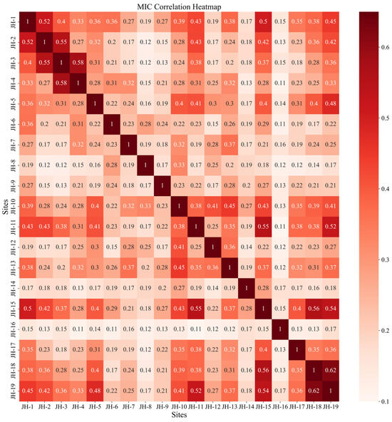 After adjusting for time lag, the spatial correlations for each site at the optimal lag time were obtained. As shown in Figure 7, it can be observed that the MIC values for TP data at the JH-16 site with other sites are all below 0.17, and this site does not exhibit any significant time lag phenomena with adjacent sites. Therefore, this site contributes little to the model’s TP prediction. Additionally, monitoring sites with close proximity tend to have similar water quality conditions, leading to multicollinearity in model inputs that can reduce the stability and accuracy of model predictions. Combining Figure 1 and Figure 7, it can be inferred that the JH-18 site is situated between JH-19 and JH-15, with JH-18 being too close to JH-19, resulting in similar water quality conditions and excessively high correlation in TP concentration data, leading to redundant information. Similarly, the high correlation between JH-3 and JH-4 is due to their close proximity. Consequently, the model ultimately chooses to exclude the JH-19 and JH-3 sites, using the TP data from the remaining 16 sites as model inputs for prediction.