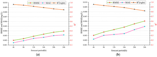 The data adjusted and filtered in Section 3.2 were used for model prediction. The primary aim of water quality prediction is to obtain accurate forecasts for specific monitoring sites. Therefore, this study selected representative sites, namely JH-13 and JH-15, for validation and analysed the robustness and generalisation performance of the GAT-Informer model. Predictions were made for the future 4 h (1-step) total phosphorus concentration at the JH-13 site, considering the past 24 h (6 steps), 48 h (12 steps), 72 h (18 steps), 96 h (24 steps), 120 h (30 steps), 144 h (36 steps), and 168 h (42 steps). Additionally, the past 96 h (24 steps) were used to predict the future 4 h (1-step), 8 h (2 steps), 12 h (3 steps), 16 h (4 steps), 20 h (5 steps), and 24 h (6 steps) total phosphorus concentrations at the representative JH-13 and JH-15 sites, to assess the model’s robustness accuracy.
