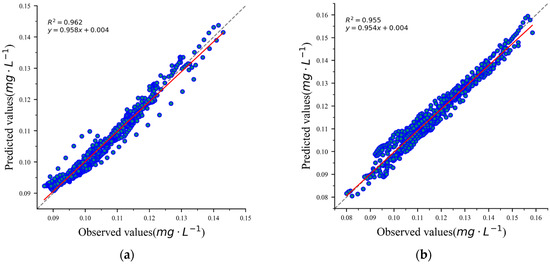 Scatter plot of predicted total phosphorus (TP) results. (a) Scatter plot of 4h ahead forecast for site JH-13; (b) scatter plot of 4h ahead forecast for site JH-4.