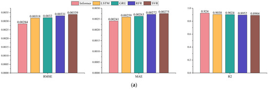 In order to fully demonstrate Informer’s excellent capability in modelling and analysing total phosphorus time series, comparative experiments were constructed using two classical deep neural networks (LSTM and GRU) and two forecasting models based on machine learning approaches (RFR and SVR). The hyperparameters for each model were determined using a grid search and are listed in Table 5. Figure 10 gives the results of these network models for time series predictors at two typical sites. The results show that the Informer model achieves the best prediction results on two typical sites. The possible reasons are that the Informer model can effectively handle long time series data based on the structural properties of encoder and decoder, and based on the ProbSparse attention mechanism, the model can effectively analyse the deep hidden features in the water quality total phosphorus data series, so as to obtain better prediction results of water quality total phosphorus. Additionally, Informer employs a generative decoder that requires only a single forward pass to generate long-sequence outputs. This approach avoids error propagation during the result output stage and exhibits good predictive performance under long time scales.