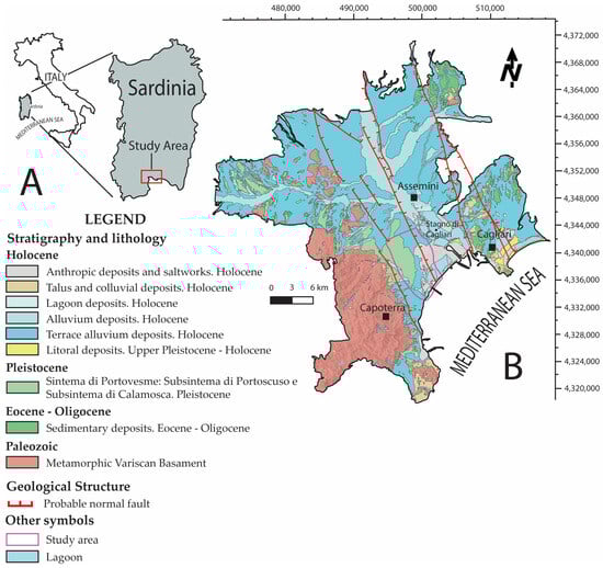 The study area is located in the southwestern portion of the Campidano Plain, which is shaped into a graben formed during Oligo-Miocene times [43]. The graben is bounded by NW-SE trending faults reactivated during the Messinian [68] and the Plio-Pleistocene after the opening of the south Tyrrhenian basin [69,70,71,72]. The NW-SE trending faults display a Palaeozoic basement, which evolves into the mountain belts, while the infill is characterised by a sedimentary sequence of Oligocene–Holocene age (Figure 1B), where Quaternary sediments are expected to be at least 150 m thick, as shown by several borehole logs available in the Capoterra area [73] (Figure 2).