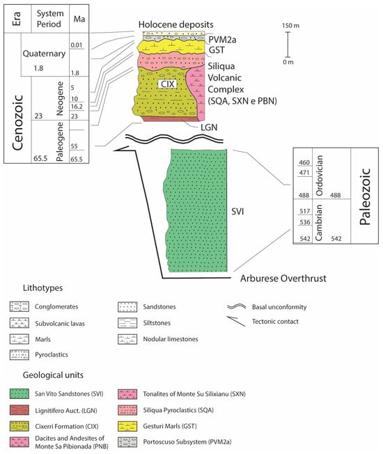 - Carmignani, L.; Oggiano, G.; Barca, S.; Conti, P.; Salvadori, I.; Eltrudis, A.; Funedda, A.; Pasci, S. Geologia della Sardegna. Note illustrative della Carta Geologica della Sardegna a scala 1:200,000. In Memorie Descrittive Carta Geologica d’Italia; Istituto Poligrafico e Zecca dello Stato: Rome, Italy, 2001; p. 60. Available online: https://www.academia.edu/16956720/Geologia_della_Sardegna_Note_illustrative_Della_Carta_Geologica_in_Scala_1_200_000 (accessed on 25 May 2024).