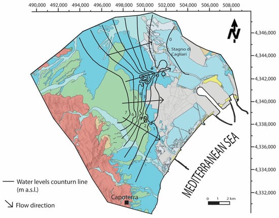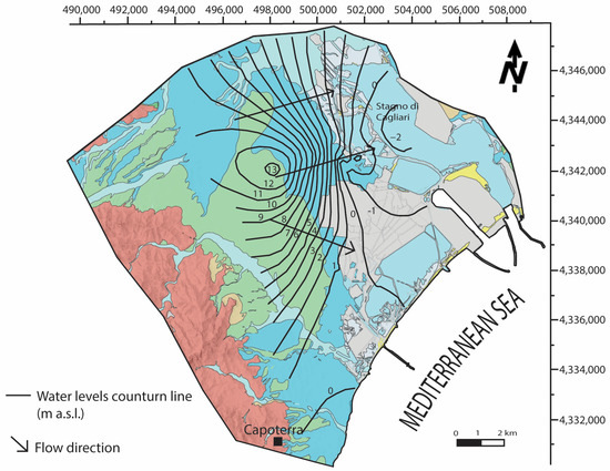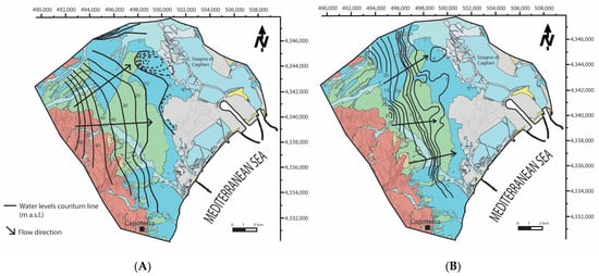 Groundwater heads of the Capoterra Plain were the subject of previous studies. Figure 3 shows the comparison between groundwater contour maps for the shallow aquifer in January 1993 [79] (Figure 3A) and November 2008 [80] (Figure 3B). In both studies, groundwater heads decrease more or less regularly from the western sector towards the middle of the plain, with a W-E direction. Both groundwater contour maps indicate groundwater head depressions due to aquifer exploitation at least in two different areas, where groundwater heads decrease below the sea level. The first one is located on the northern side of the plain, while the second is located close to the saltworks and lagoon. Both interpolations show similar groundwater flow patterns.