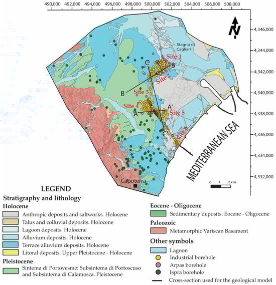Below Holocene deposits, the ‘Subsintema of Portoscuso’ and ‘Subsintema of Calamosca’, part of the ‘Sintema of Portovesme’ occur (Figure 8). The ‘Subsintema of Portoscuso’, which characterises the centre of the plain, represents a continental deposit made of medium to coarse terraced alluvial gravels with subordinate sand and gravel, having a planar cross-bedding stratification [82]. On the contrary, the ‘Subsintema of Calamosca’ represents a sandy deposit with a bidirectional tidal structure, made of sparse mollusks (i.e., Astrea Rugosa, Conus sp., Glycymeris glycymeris, Arca noae). Cross-section A-A’ (Figure 8) exhibits fine sediments of tentative Pleistocene age, in accordance with the presence of the ‘Subsintema of Portoscuso’ [73]. These fine sediments were supposed to be of a Pleistocene age, different from available cartography data.