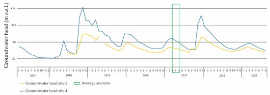 The graph shows the groundwater head variation in site 4 and site 2 from March 2017 to September 2023 on a weekly basis. The green box highlights the selected average scenario of April 2021 used for modelling purposes.
