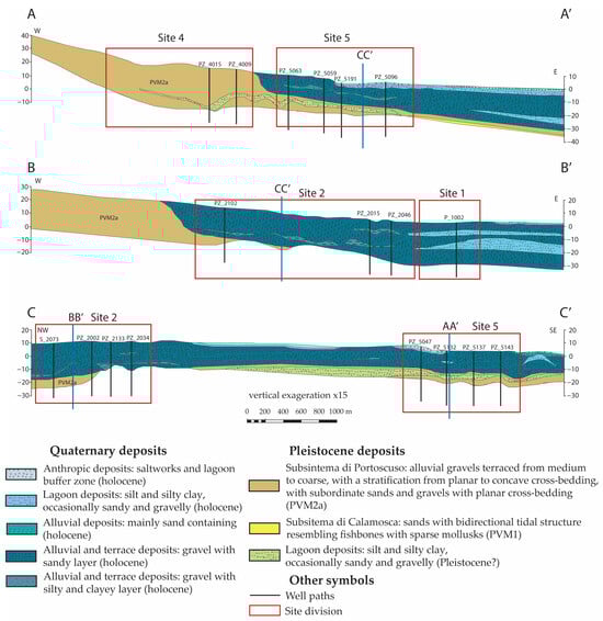 The cross-sections show the distribution of Quaternary–Pleistocene deposits in the study area. The cross-sections A-A’ and B-B’ show a transition from W to E of coarse to fine sediments, while cross-section C-C’ shows, from NW to SE, respectively, terraced alluvial deposits above Subsintema of Portoscuso and lagoon deposits located near the saltworks. The positions of the cross-sections are indicated by the black line shown in Figure 5.