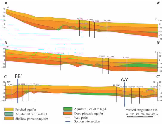 The hydrogeological model was developed using Petrel 2021©. Borehole log analysis and facies interpretation of the lithological data were carried out and imported into the software. Subsequently, the hydrogeological correlation process was performed (Figure 10). Following the data logs, two aquitards were correlated, also considering groundwater head values (Figure 10): a shallow aquitard (10 m b.g.l.) locally supporting a perched aquifer and a second aquitard located about 20 m b.g.l., dividing the phreatic aquifer into two separated portions (a shallow and a deep one, the latter locally and partially confined) (Figure 9).