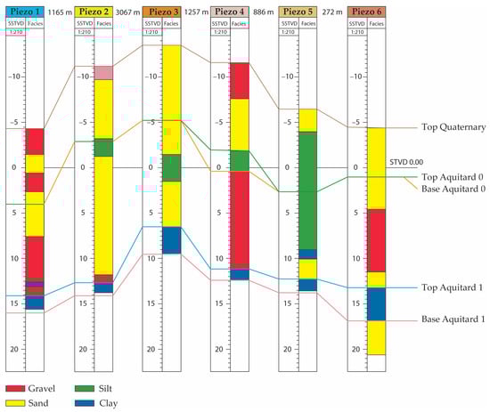 The hydrogeological correlation allowed the definition of the possible surfaces, which characterised the hydrogeological model. By following the lithology of the borehole log data, it has been possible to define the presence of a shallower aquitard (Aquitard 0; highly discontinuous) and a deeper aquitard (Aquitard 1) that define the phreatic aquifer targets of the study.