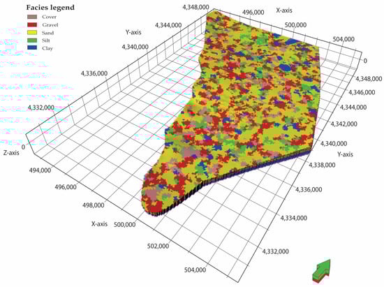 The result of the facies distribution, using the “Sequential indicator simulation” algorithm and a variogram (400 m × 400 m), is the distribution of the five main facies classes, which were obtained from the description of the lithological logs (Figure 11).