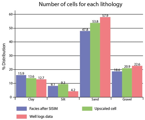 Figure 12 illustrates the cells’ percentage distribution assigned to each lithology within the model, after the application of various processes. The figure highlights how these percentages evolve through different stages: from the initial state, when well logs were first imported, to the scaling-up process, and finally to the lithological distribution carried out by the algorithm. These changes in percentages are influenced by both the number of layers used in the model and their respective thicknesses. Generally, the greater the number of layers, the thinner each layer becomes, resulting in smaller variations in cell distribution percentages during the processing stages.