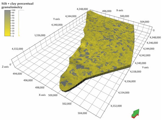 Result of the sum of silt and clay distribution using the “Sequential Gaussian Simulation” algorithm and a variogram 400 m × 400 m. The model in the figure shows the distribution of the percentages of grain sizes of silt and clay, achieved from the stratigraphic descriptions of the facies. The green arrow points north.