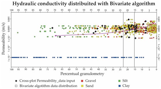 The granulometric distribution that was previously achieved, which was added with the combination of SGS with a bivariate algorithm, was able to reconstruct a distribution of a given cross-plot. The results are represented in Figure 14, where the distributed geostatistical samples of the facies were visualised as the Z-axis. Figure 14 shows how the gravel and sandy facies are much more concentrated in proximity to higher hydraulic conductivity values and have a lower percentage of fine granulometry. The hydraulic conductivity distribution was achieved by applying the bivariate algorithm with the granulometric percentages of the silt and clay distributions.