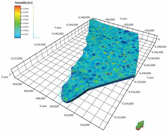 To maintain aquifer heterogeneity, grain size distribution was uploaded. The stratigraphic descriptions were converted into granulometric classes in compliance with the Italian Geotechnical Society (Associazione Geotecnica Italiana—AGI, 1977) guidelines. The simulation of the grain size classes, in % value, was nested within the previous simulation using the “Sequential Gaussian Simulation” algorithm (SGS) for each single facies code. The SGS method is a conditional simulation following a sequential principle under the multi-Gaussian random function model [87,88].