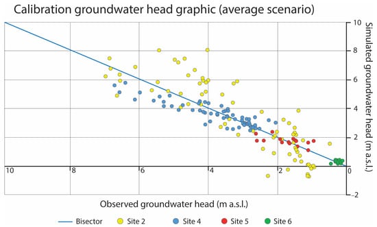 Figure 6 shows groundwater head seasonal fluctuations at site 2 (yellow line) and site 4 (blue line), with the latter showing higher values (i.e., larger seasonal oscillation amplitude) during rainy periods. This can be explained by the different positions of the two sites, with the former being closer to the coastline and the base level represented by the sea, and the latter being located at a higher elevation, closer to the upgradient hydrogeological boundary of the aquifer, represented by the less permeable Metamorphic Variscan Basement outcrop (see site location in Figure 5. This allows the quantification of the width of seasonal groundwater head oscillations and therefore identifies the possible scenarios to be used as reference for numerical flow simulations. For model calibration, an average groundwater head scenario was defined and identified in April 2021 (green box, Figure 6).